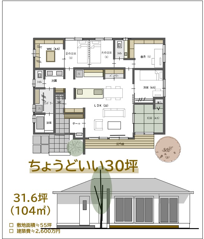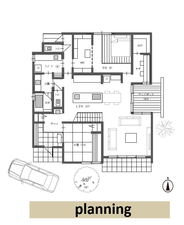 家族構成は、夫婦+子供1人で、子供が巣立った後は夫婦2人暮らしでも楽しめる間取りです。
