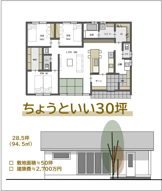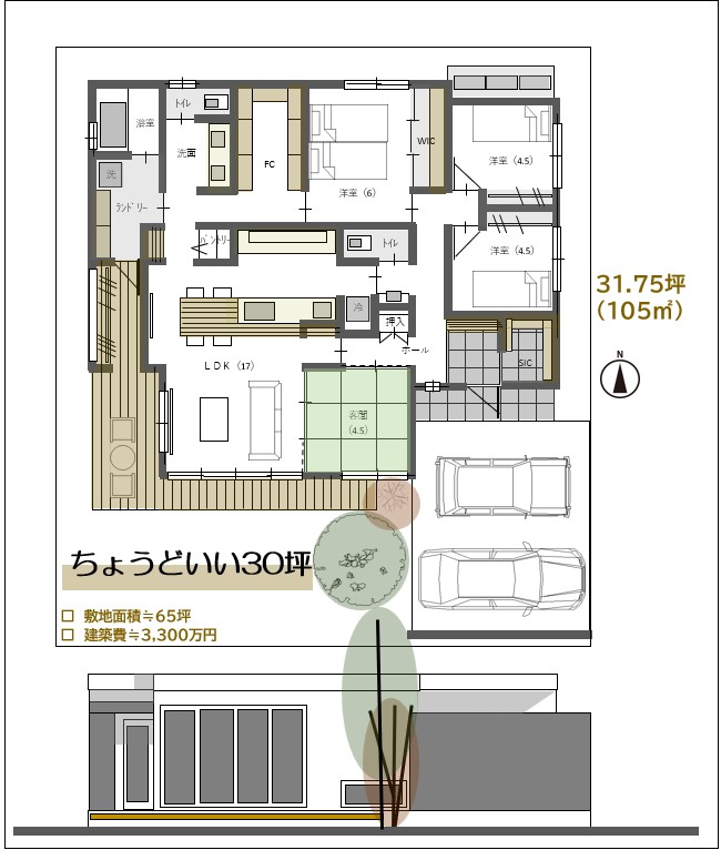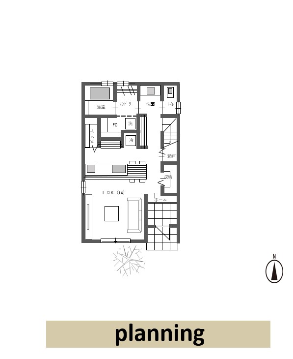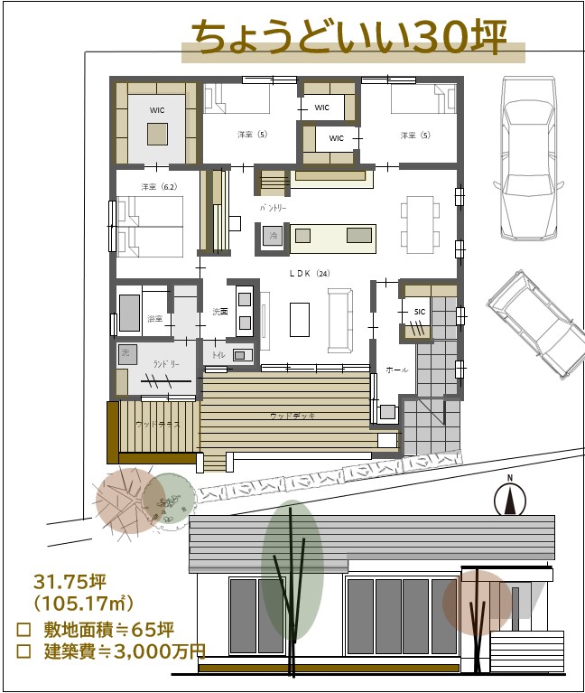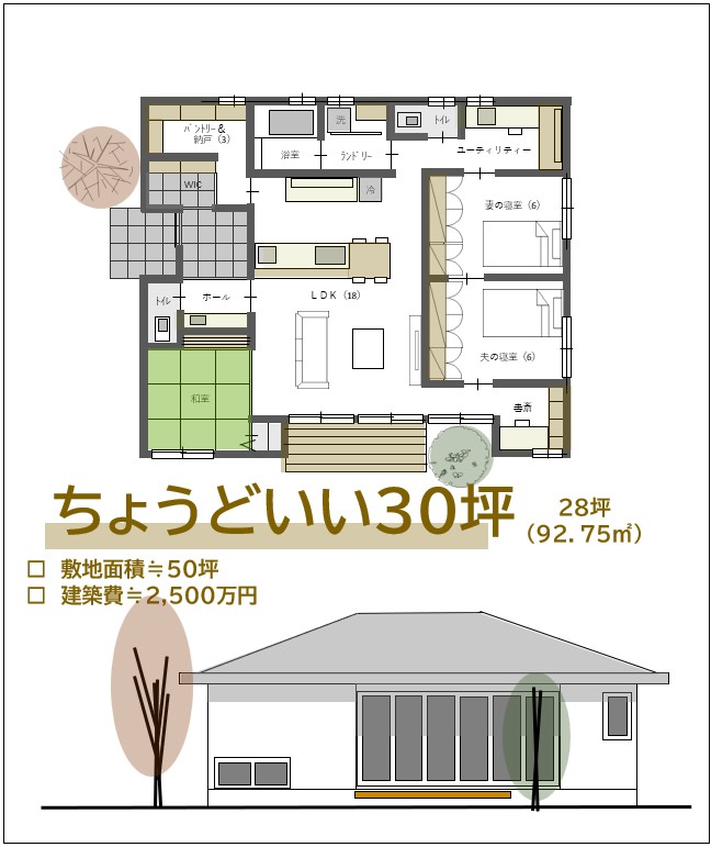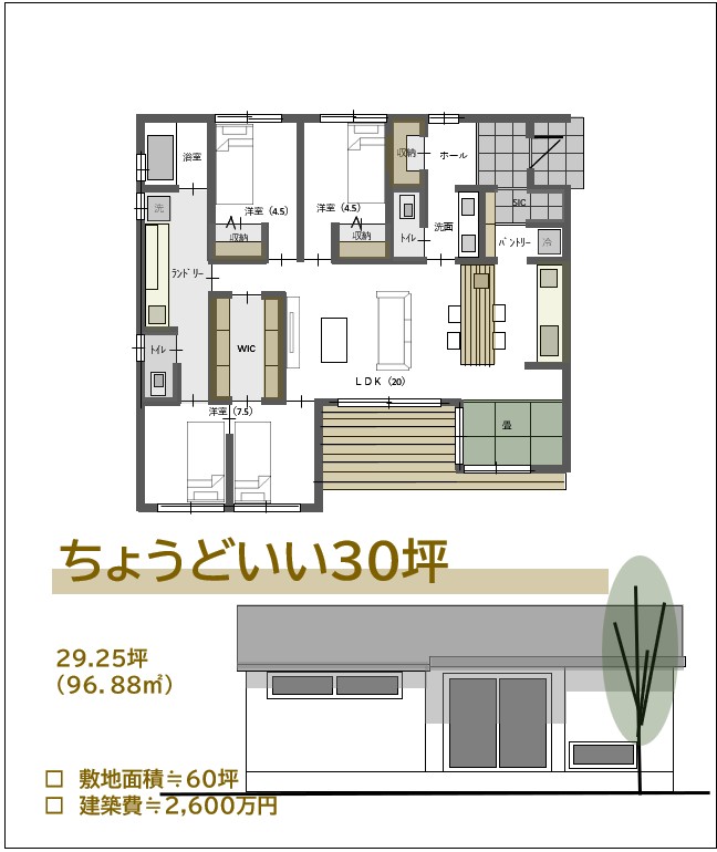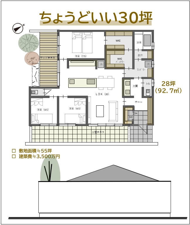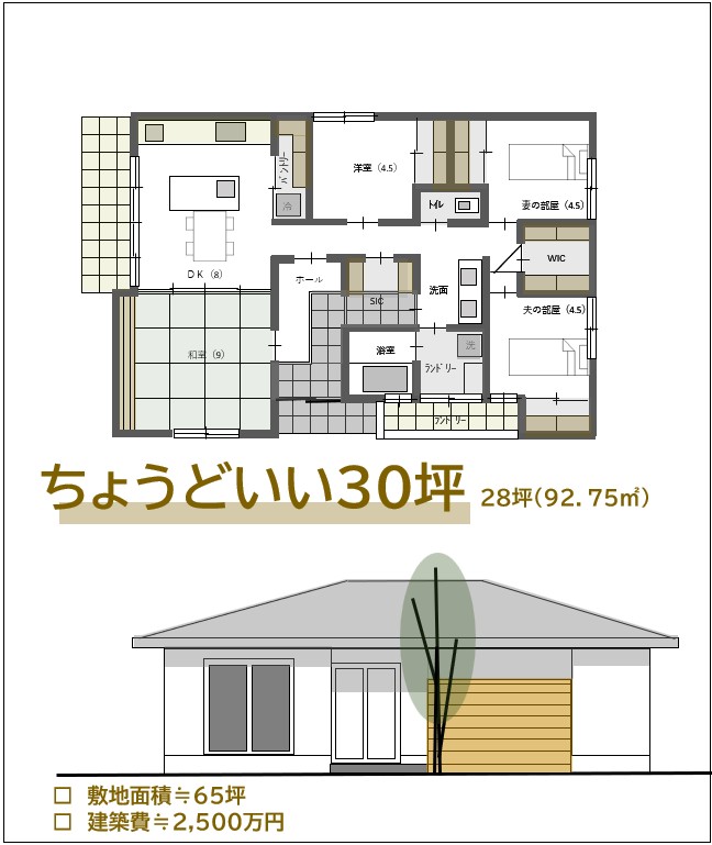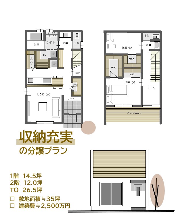 敷地35坪の都市部の分譲宅地に建築が可能な、収納に工夫した間取り例です。