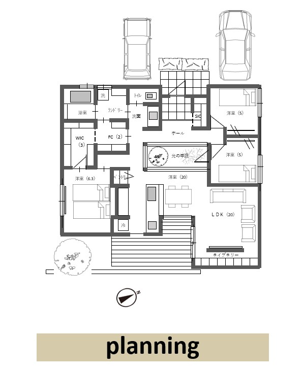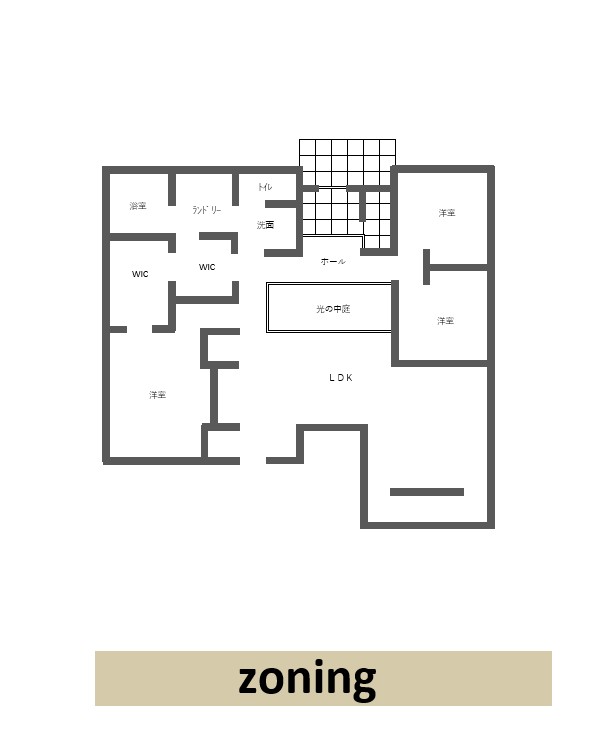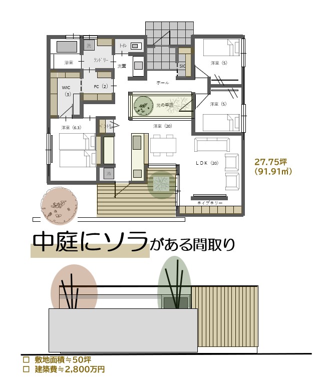 人気の平屋で、家の中心に中庭(空からの光窓)がある間取りです。玄関ホールのデザイン性は圧巻で、リビング側も空からの光が明るく、特別感を演出できる設計です。