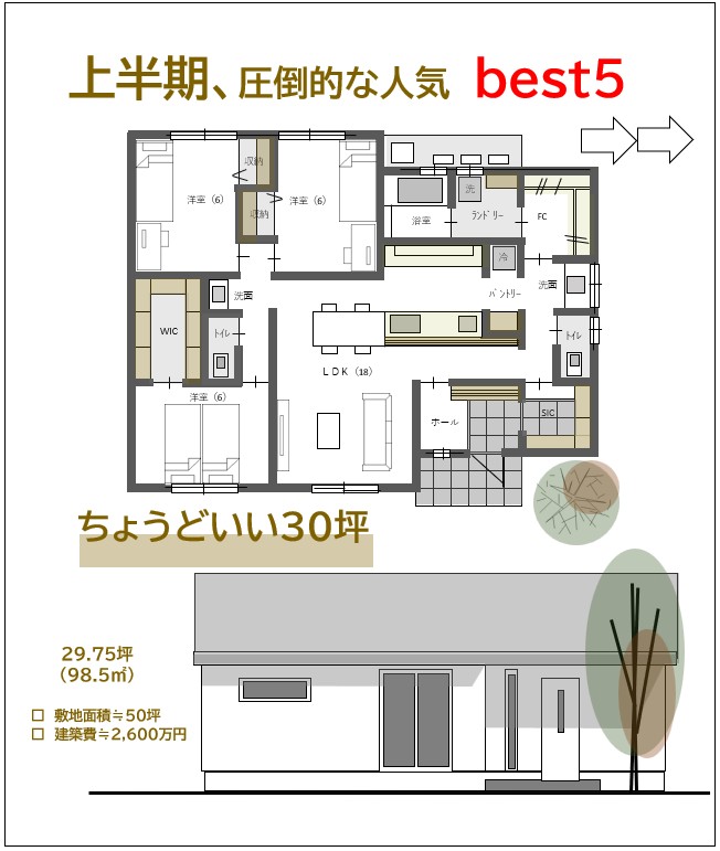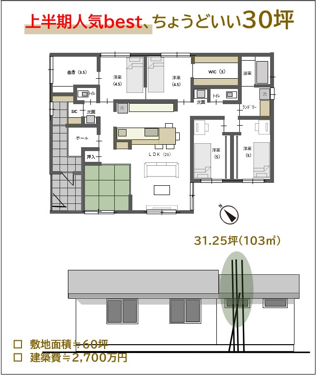 25坪+2階テラス+吹抜けにより、坪数よの大きく感じる外観・内観のデザインが特色です。