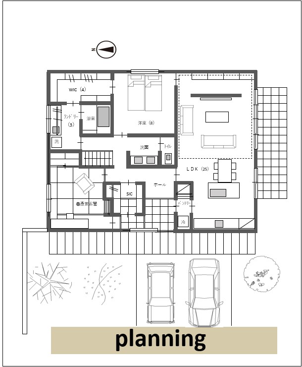 広い敷地を最大限活用した平屋の間取りです。車好きのご夫妻はリビングから愛車を眺め、中庭を一体化して広く感じるゾーニングが最大のポイントです。