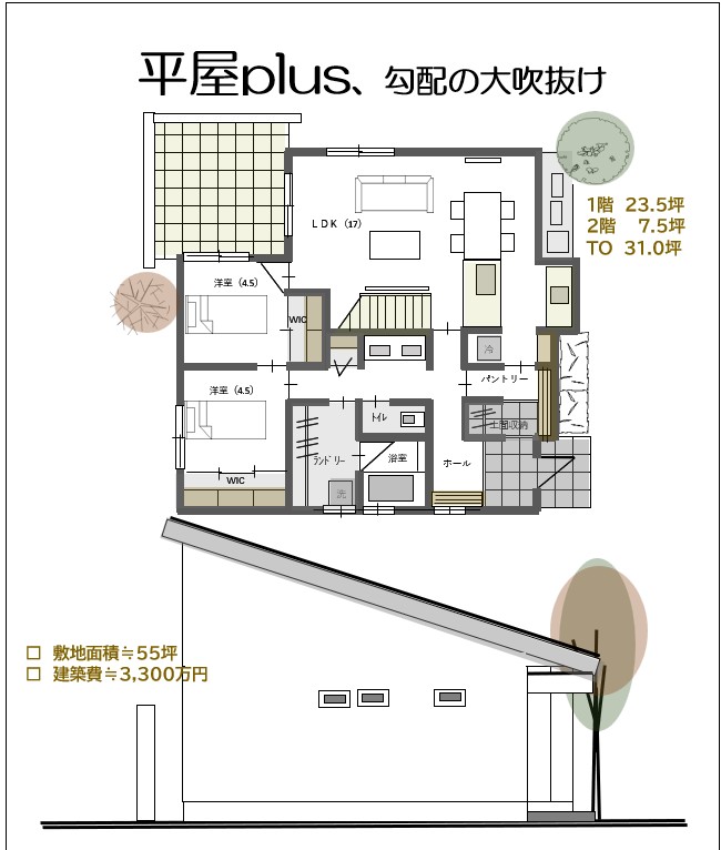 カテゴリー 間取り (vol.184)平屋plus 勾配の大吹抜け 投稿者 作成者: 管理人 投稿日 2025年12月17日 開放的にリビングがプランの特色ですが、帰宅動線、家事動線、も重視した間取りです。 ← (vol.183)シニア世代の平屋/20坪2000万円